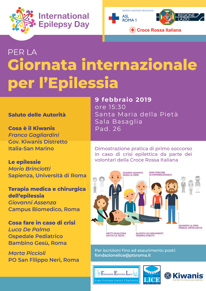 Appuntamento con la “Giornata internazionale per l’epilessia”, un’occasione di confronto e di approfondimento che il prossimo 9 febbraio vedrà insieme a Roma chi da anni è impegnato in prima linea su questa patologia, grazie ad un’iniziativa promossa da ASL Roma 1 e Croce Rossa Italiana, in collaborazione con LICE (Lega Italiana Contro l’Epilessia) e con Kiwanis distretto Italia-San Marino, organizzazione mondiale di volontariato presente attivamente in 80 Paesi.